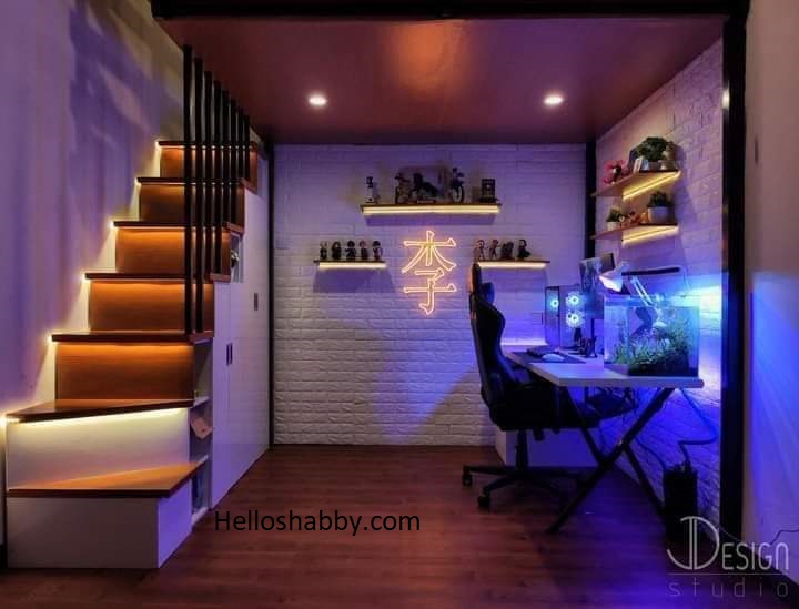 The bedroom is even more dynamic and unique by adding blue neon lights, which give the room a cool and dreamy look.
