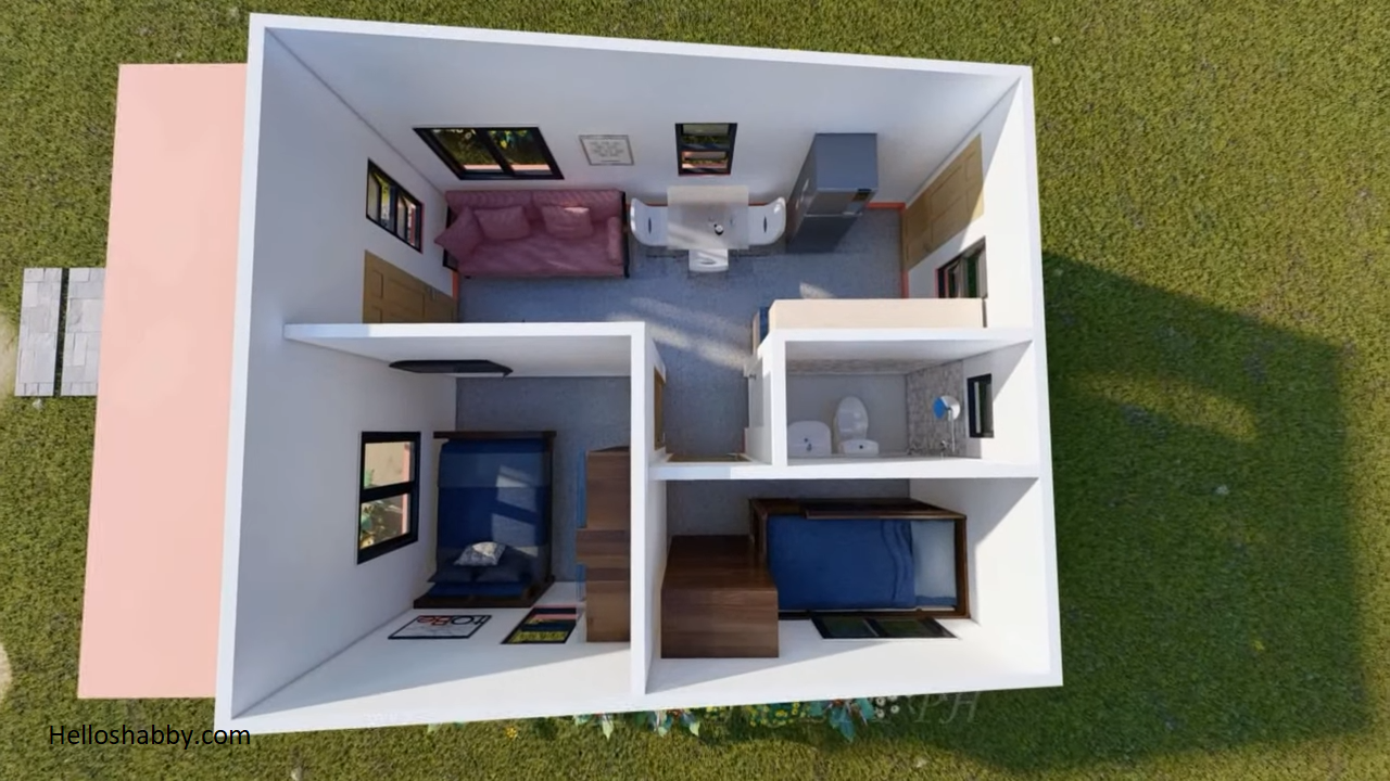 This is how the house is laid out. You can find the living room and kitchen right when you open the main door. The bathroom is in the center area for easy access. There are two bedrooms, one made in bunk bed style to get more sleeping space.