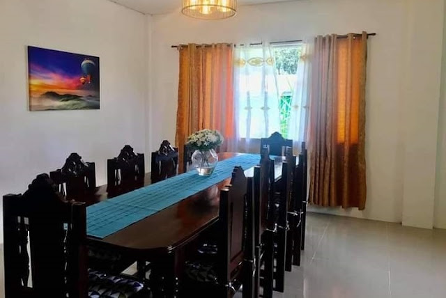 For the design of this dining room presents a comfortable impression with an elongated shape. The design of the dining room is suitable for use when receiving guests so it looks comfortable. Equipped with chairs set of wood material this dining room look naturaldan also minimalist. In order not to seem empty you can apply a beautiful and unique painting.